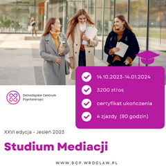 Zajęcia w Studium Mediacji prowadzone są przez doświadczonych trenerów mających w swoim dorobku prowadzenie od przeszło 15 lat warsztatów i szkoleń dla specjalistów pomocy psychologicznej w Dolnośląskim Centrum Psychoterapii, oraz szkoleń na zamówienie instytucji i firm na terenie całej Polski. Nasi wykładowcy to certyfikowani psycholodzy, rekomendowani mediatorzy, prawnicy, wieloletni praktycy terapii indywidualnej i terapii grupowej, pracownicy Uczelni Wyższych i sądownictwa.